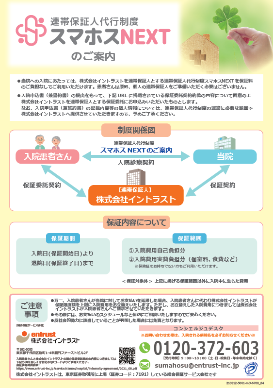 当院では、令和8年1月1日から連帯保証人代行制度及び医療費用保証制度を導入しています。